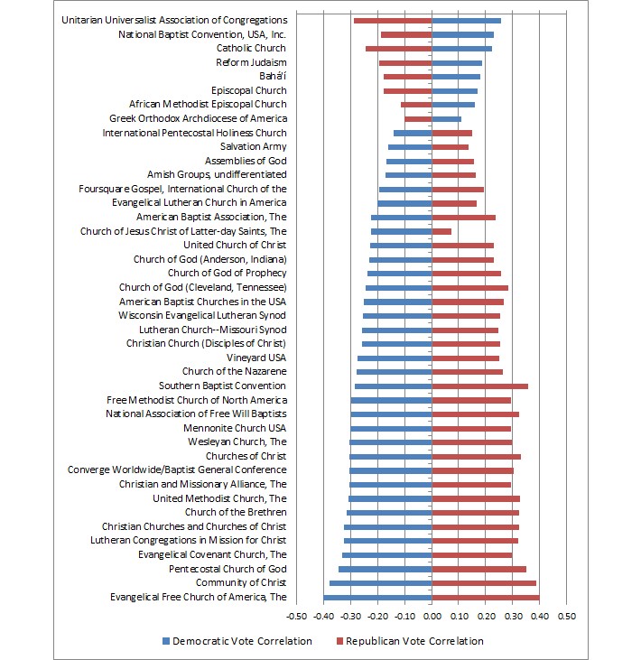 Many of the nation's widespread religious groups correlate to some degree with Democratic or Republican voting patterns. See full report here.